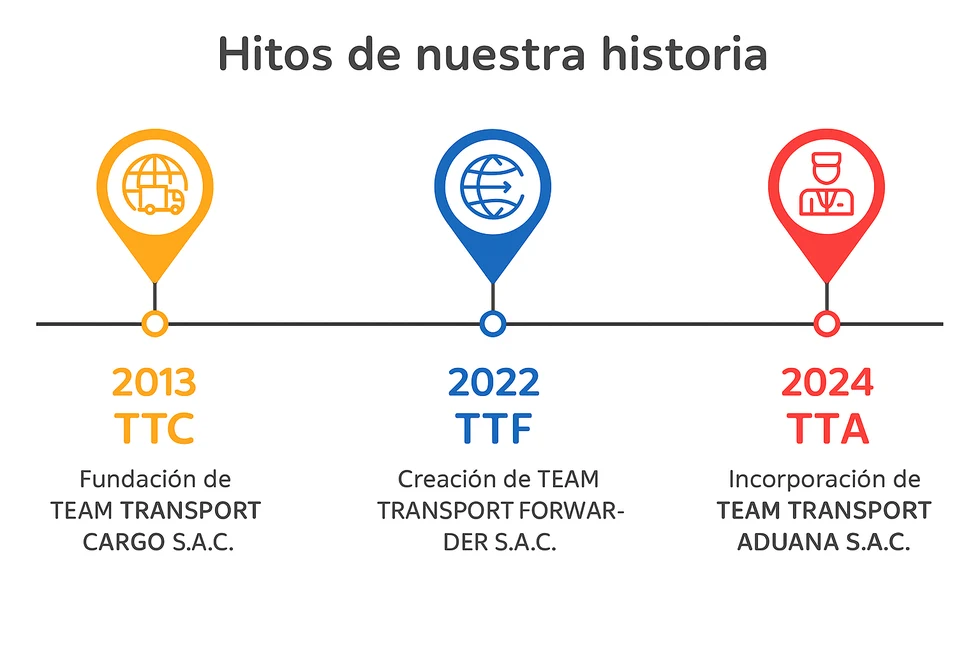 En 2022, con el objetivo de brindar soluciones logísticas integrales, creamos TEAM TRANSPORT FORWARDER S.A.C. (TTF), especializada en carga internacional, ampliando así nuestra cobertura y capacidad en el comercio exterior.